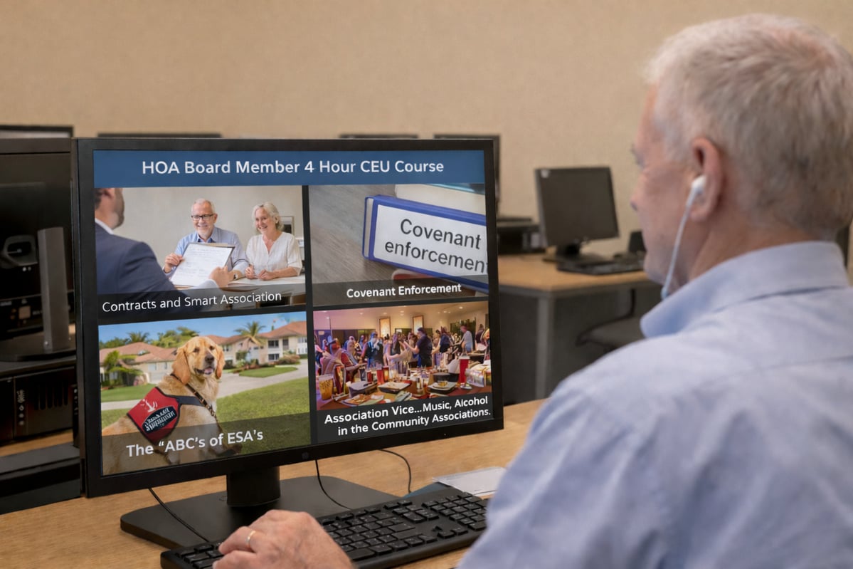 This single-session “mega‑course” is designed to give HOA board members four required CEU credits in one afternoon. These four continuing education credits fulfill the new legislative requirements. This new legislation states that HOA board members of associations with less than 2,500 parcels must complete 4 hours of continuing education annually. Associations with more than 2,500 parcels must complete 8 hours of continuing education annually.